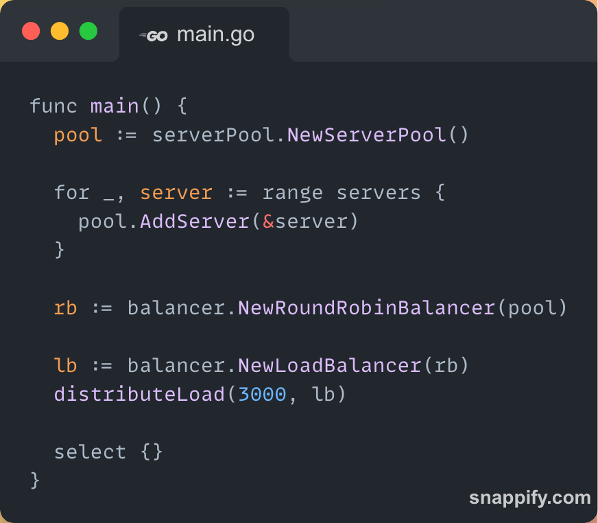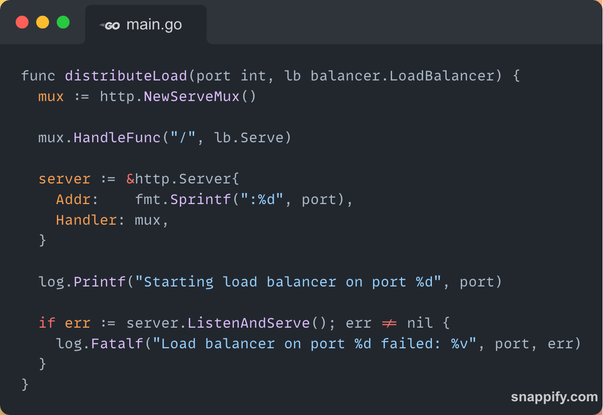 This is the entry point of our load balancer. Everything comes together here—from defining backend servers to starting the load balancer on a specific port.
