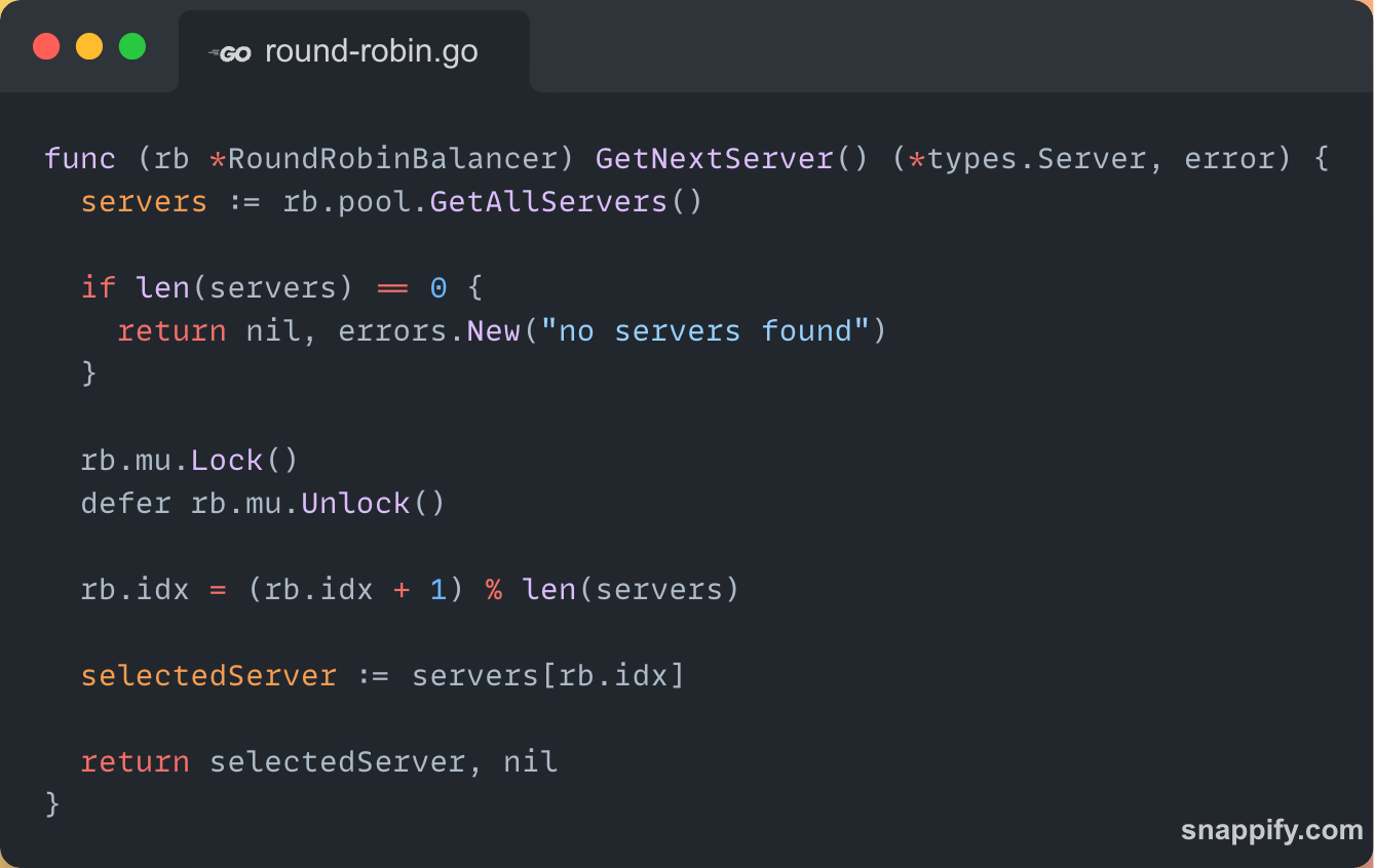 This piece of code implements the Round Robin strategy for our load balancer. The goal here is to pick the next server from the pool in a circular order—one after another—so that the load is evenly distributed.