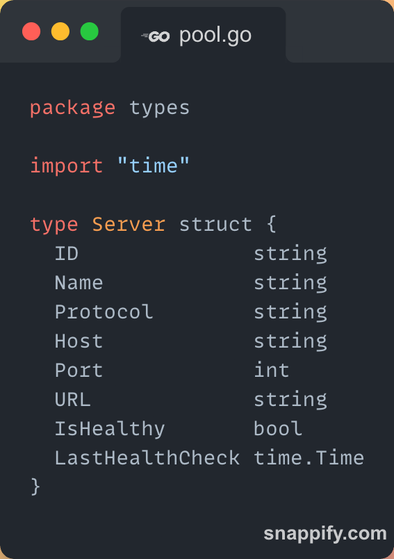 To keep track of each backend server, we define a Server struct. This struct holds all the important information related to a single server instance.