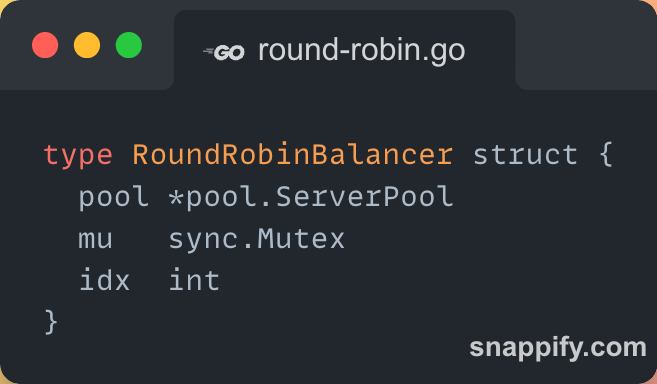 poolholds the list of all available servers.muis a mutex that makes sure two requests don’t try to access or update the index at the same time. This is important because our load balancer might be handling multiple requests at once.idxkeeps track of the last server we selected. We’ll use this to pick the next one.