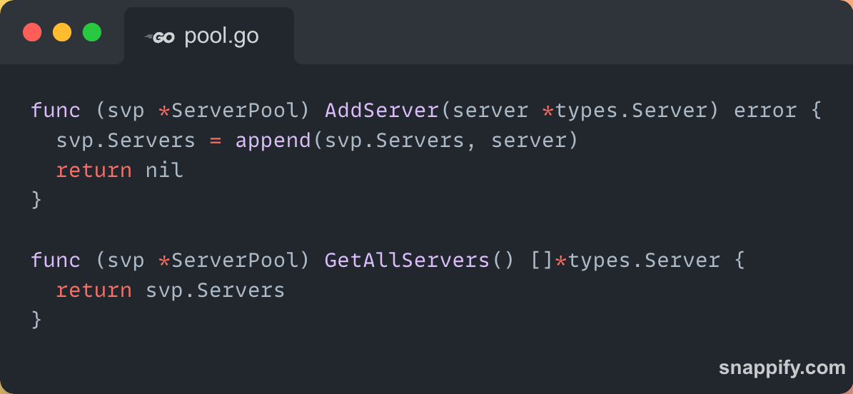 Every time we want to add a new backend server, we call this AddServer method. It simply appends the new server to our list.