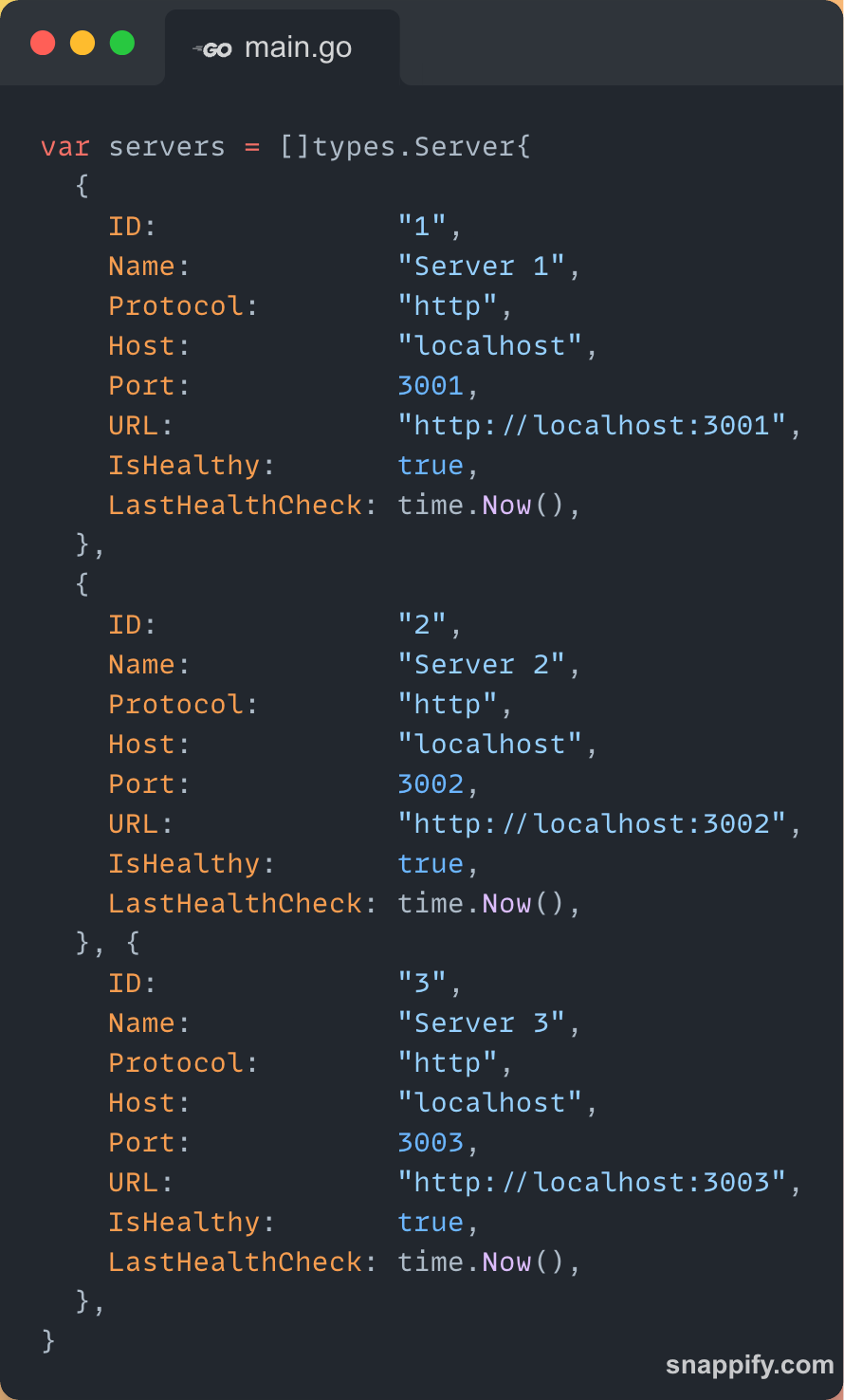 Here we define three servers. Each server has a unique ID, name, and a URL where it's running (e.g., http://localhost:3001). These are the backend servers that will actually handle the incoming requests. We also set IsHealthy to true and record the current time as LastHealthCheck. For now, we’re manually marking them as healthy.